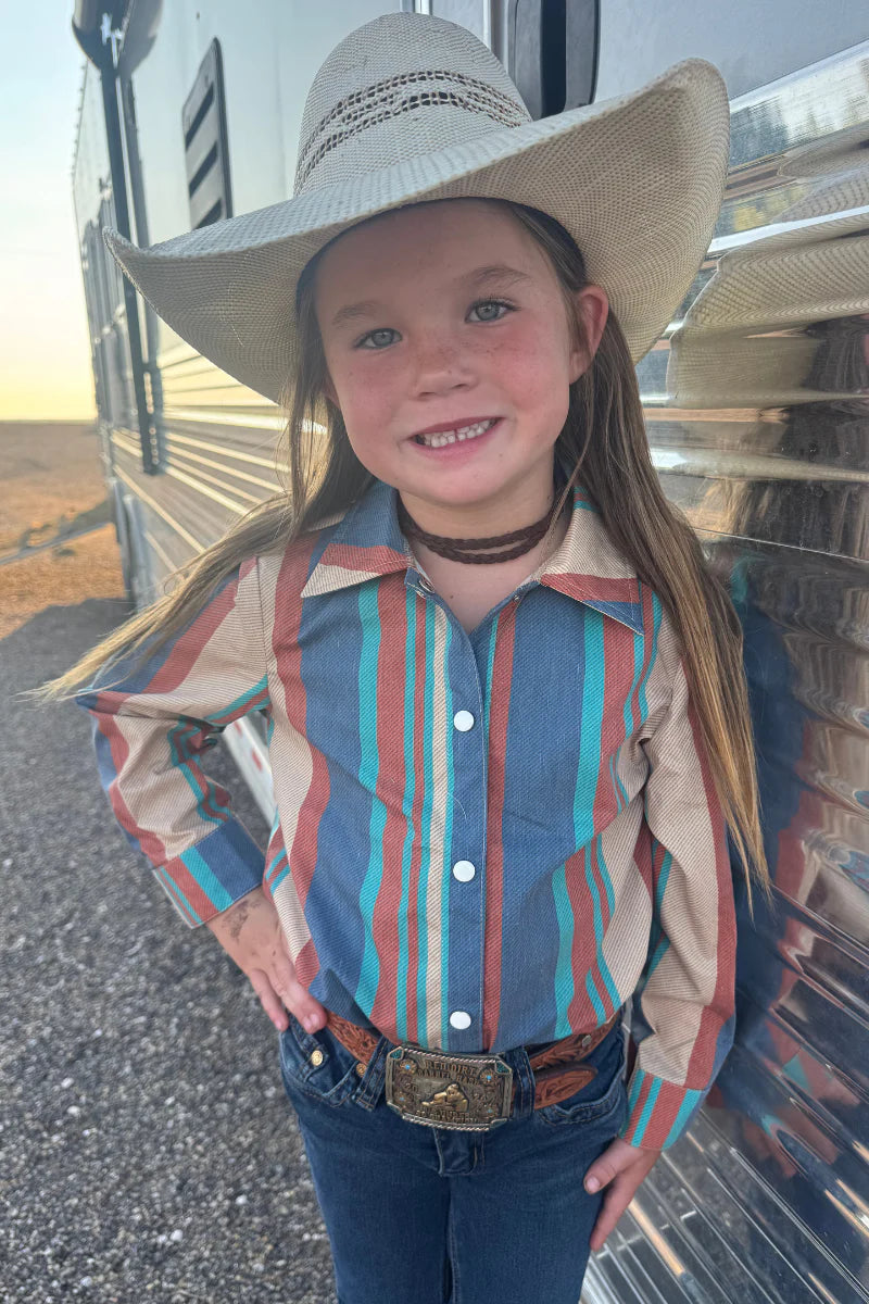 This 'Til You Can't Button Up Kids shirt features classic pearl snap buttons and a stylish pattern of neutral stripes accented with pops of color. Designed for ease and comfort, it adds a playful yet polished look to your child’s wardrobe, perfect for everyday wear or special occasions. Durable and eye-catching, it ensures they stay comfortable and confident wherever they go.